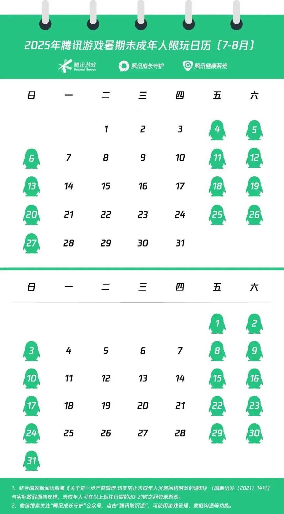 暑期来临,网易游戏和腾讯游戏相继发布暑期未成年人游戏限玩日历。3日,腾讯游戏发布了未成年人暑期限玩日历,7月1日-8月31日未成年玩家可以在每周五、周六、周日的晚上20点-21点体验游戏,整个假期总计