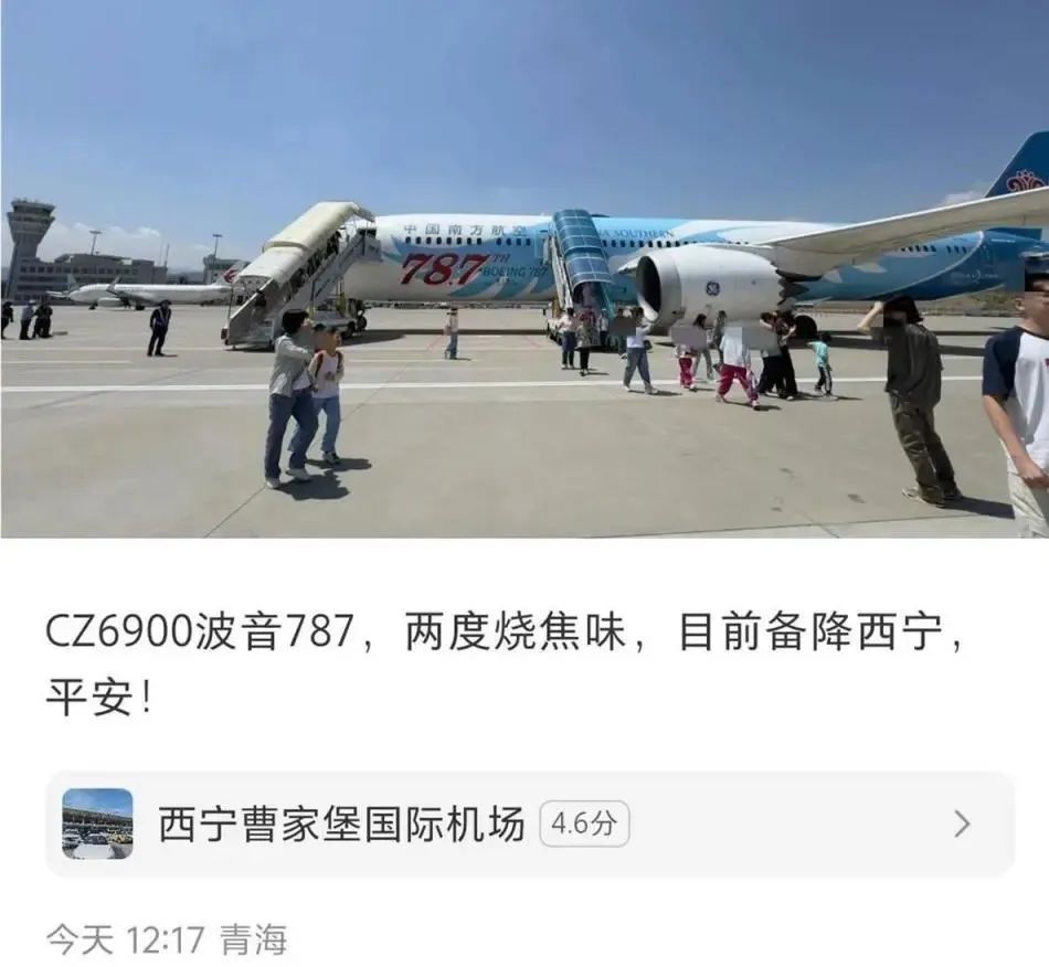 7月10日中午,有网友发帖称,南航CZ6900航班出现烧焦味,备降西宁机场。网友称航班备降西宁记者以网友身份咨询了白云机场、曹家堡机场、天山机场和南航。白云机场客服称,该航班已于10日11时54分到达