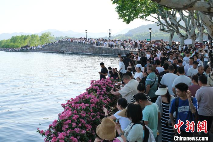 5月1日,西湖断桥畔游人如织。曹丹 摄