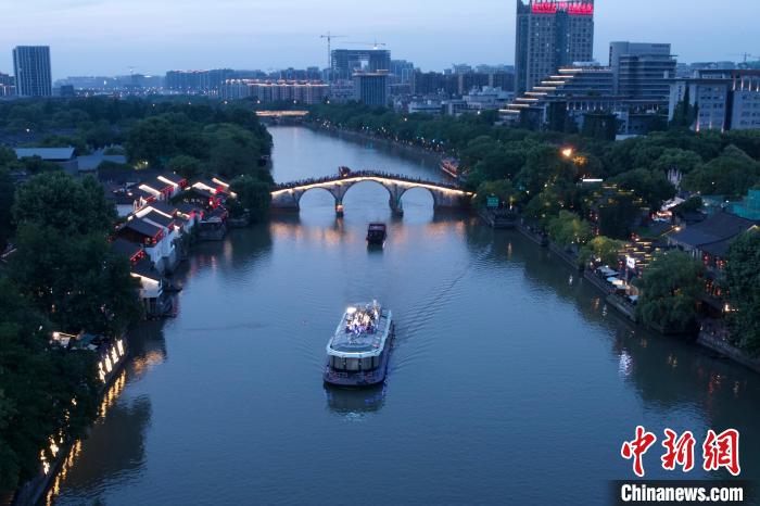 5月2日晚,游船在中国大运河(杭州段)的拱宸桥前行驶。(杭州市拱墅区文化和广电旅游体育局供图)