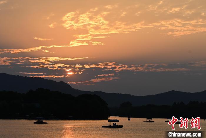 6月6日,浙江杭州西湖,晚霞映红天空,美不胜收。 中新社记者 王刚 摄