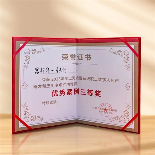 近日,由中共上海市金融工作委员会、中国人民银行上海市分行和上海市金融工会联合举办的“2025年度上海金融系统职工数字人民币研发和应用专项立功竞赛”圆满结束。在本次立功竞赛中,富邦华一银行凭借《全国首家台胞数字人民币钱包升级服务》案例荣膺三等奖,是唯一一家入选优秀案例并获得奖项的台资银行。