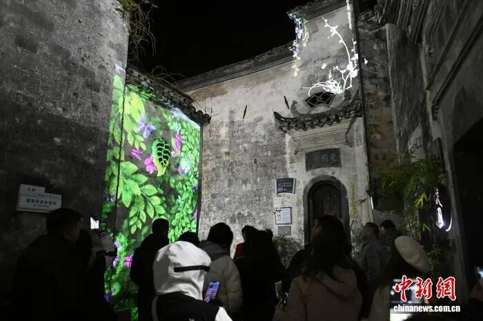 11月18日,海外华文媒体在黟县西递镇西递村观赏中国首个以徽派古村落为主体的大型“行进式”水幕演艺光影秀。中新社记者韩苏原 摄