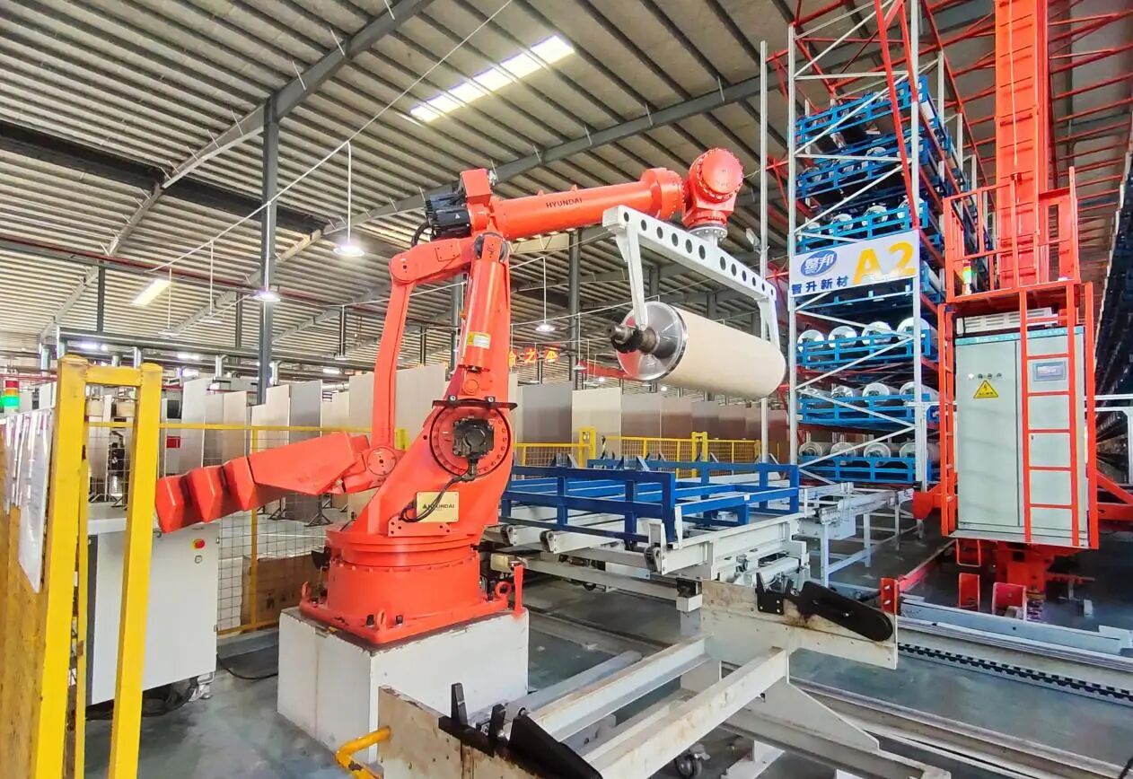 在广西智升新材料科技有限公司生产车间,多台全自动有轴凹版印刷生产线高效运转,纸张如同流畅的布匹,在精密的机械间穿梭。该企业引进安装了一个大型LED电视屏幕墙,能实时显示所有车间各个智能机器的生产数据及机器运转情况。