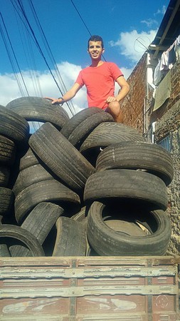 阿玛里多捡废弃轮胎。(图片来源:台湾东森新闻云)