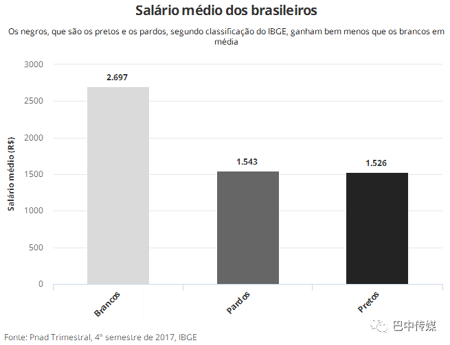 以上是来自巴西国家地理与统计局(IBGE)的数据,在2017年的第四季度里,黑人(包括棕褐色人种和黑色人种)的平均工资比白人要低1200多雷。