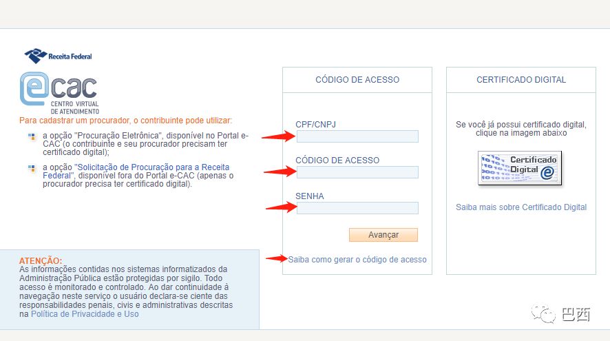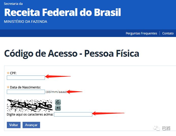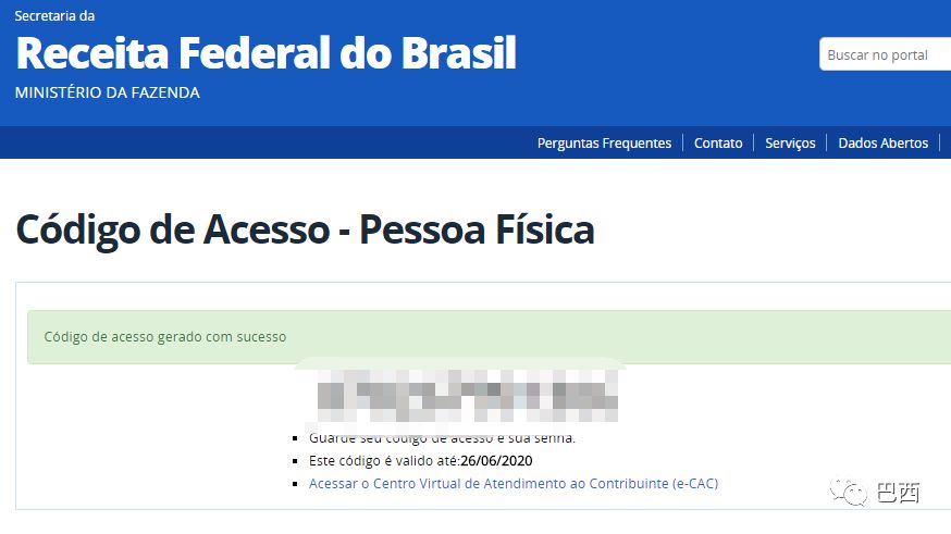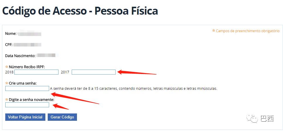 第一次需要自己生存一个,点击 Saiba como gerar o código de acesso进入,选择 Gerar código de acesso para pessoa física,依次输入税号,出生年月日和验证码。