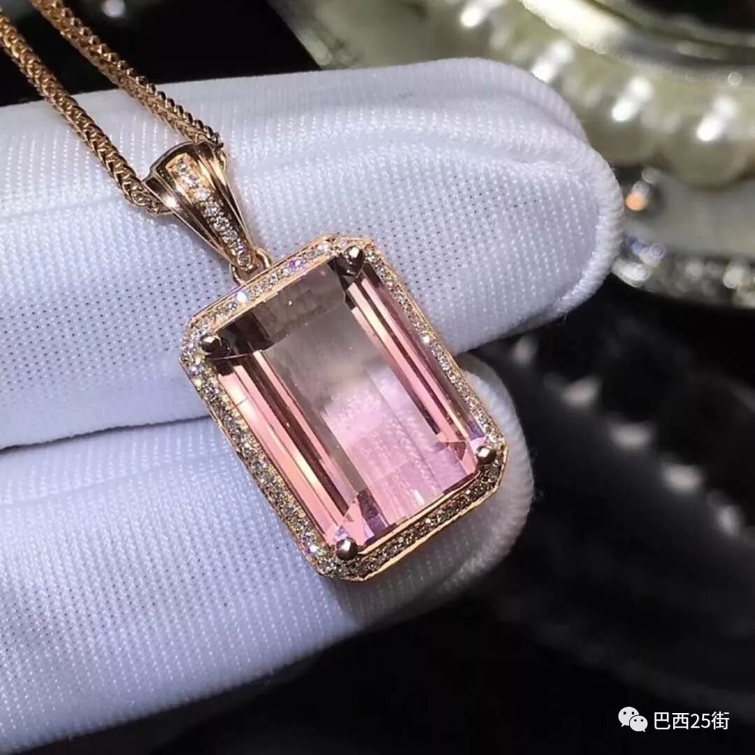 巴西天然粉碧玺吊坠18K真金真钻镶嵌、简单大气满火彩