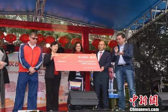 当地时间8月12日,巴西华人华侨欢庆“中国移民日”暨2018华助中心全侨慈善捐赠仪式在巴西圣保罗阿哥利马松公园举行。
