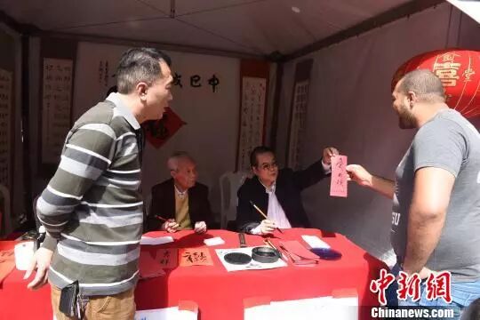图为巴西中华书法学会会长刘树德(右二)现场展示中国书法。 莫成雄 摄