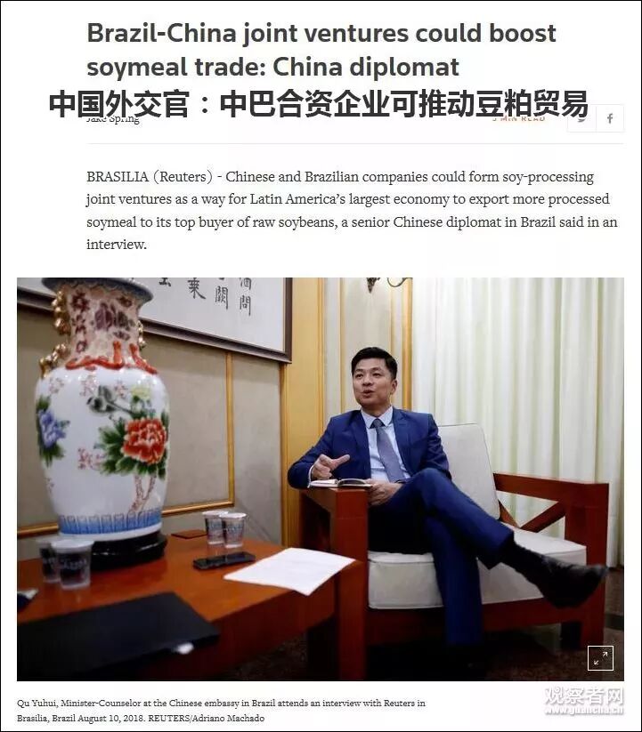 中国驻巴西大使馆公使衔参赞瞿瑜辉上周提出,中国和巴西的公司可以组建大豆加工合资企业,从而推动巴西向中国出口更多已加工的豆粕。目前,巴西是拉丁美洲最大的经济体,而中国则是巴西大豆的头号买家。