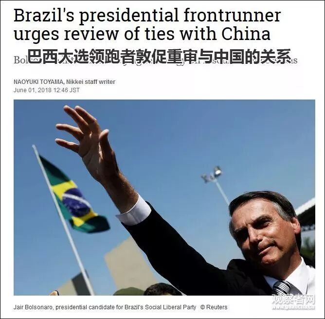 目前在竞选中占上风的右翼候选人贾伊尔•博尔索纳罗(Jair Bolsonaro)对中国在巴西购买土地和采矿业务进行了抨击。