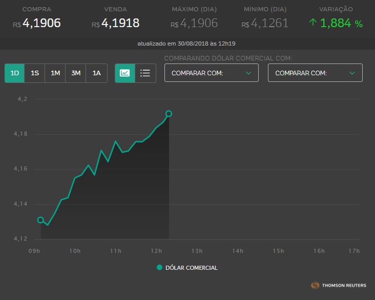 随着美元走强并受该国选举情景的影响,美元周四(30)再走高。12点左右,美元上涨 1,88%,达到4,19雷亚尔。