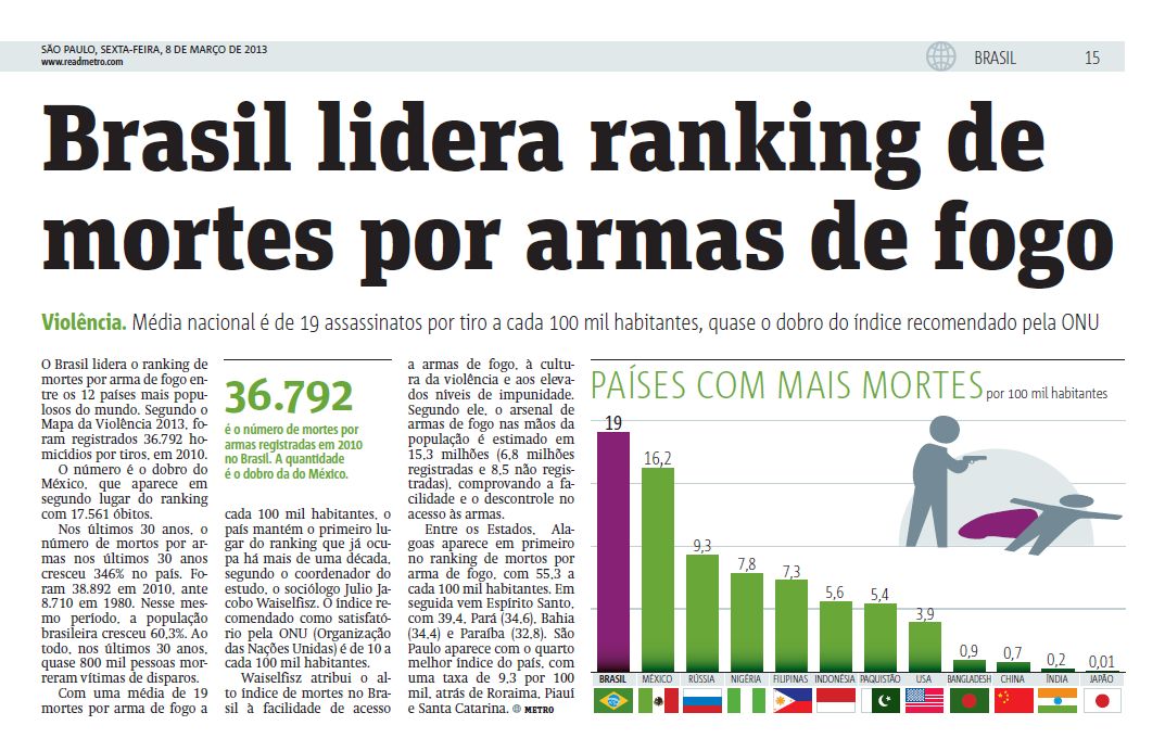 【南美侨报网编译张乔8月31日报道】美国华盛顿大学(Universidade de Washington)近日公布的一项全球枪支死亡率报告(Global Mortality From Firearms)表明,巴西已经成为全球范围内因枪支死亡人数最多的国家。