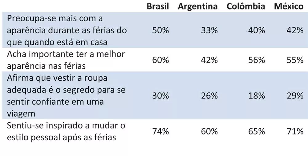 和在家时相比,50%的巴西人称在度假旅游时会更注重自己的穿着,同样高于阿根廷(33%)、哥伦比亚(40%)和墨西哥(42%)。此外,74%的巴西人认为在度假后个人的着装风格会受到影响,高于阿根廷(60%)、哥伦比亚(65%)和墨西哥(71%),在全球范围内仅低于印度(82%)。