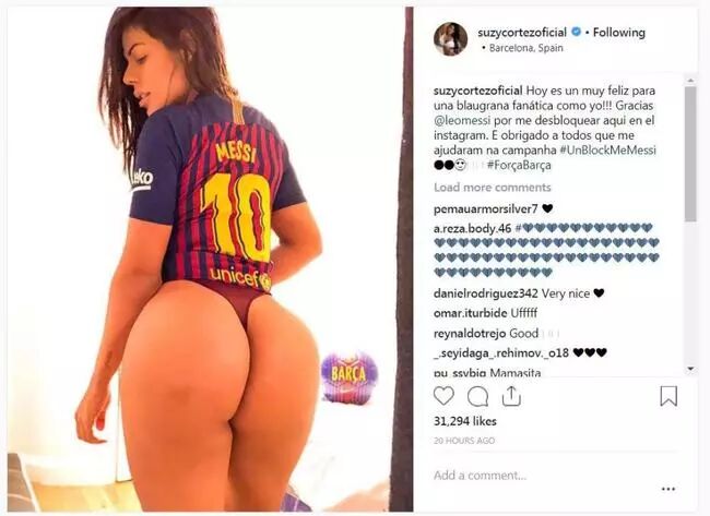 苏茜也在社交网站上对此表示了庆祝,她穿上梅西的球衣拍了一张照片,晒出自己的美臀,还贴了一头山羊和一个王冠的图案(寓意梅西是史上最佳),打出“感谢梅西”、“巴萨加油”的字样,并写道:“对像我这样的巴萨球迷来说,今天是幸福的一天,感谢梅西将我解禁。也感谢加入运动帮助我解禁的人。”