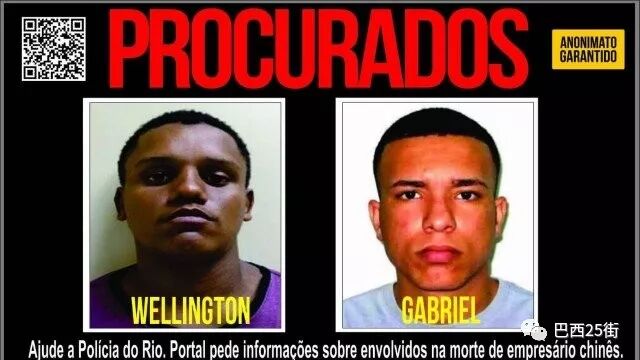 据巴西媒体报道,上个月63岁的中国商人王某被杀后,警方目前确定了其中两面抢劫杀人犯的信息。19岁的 Gabriel santos da silva 和23岁的Wellington Henrique Alves Moreira。