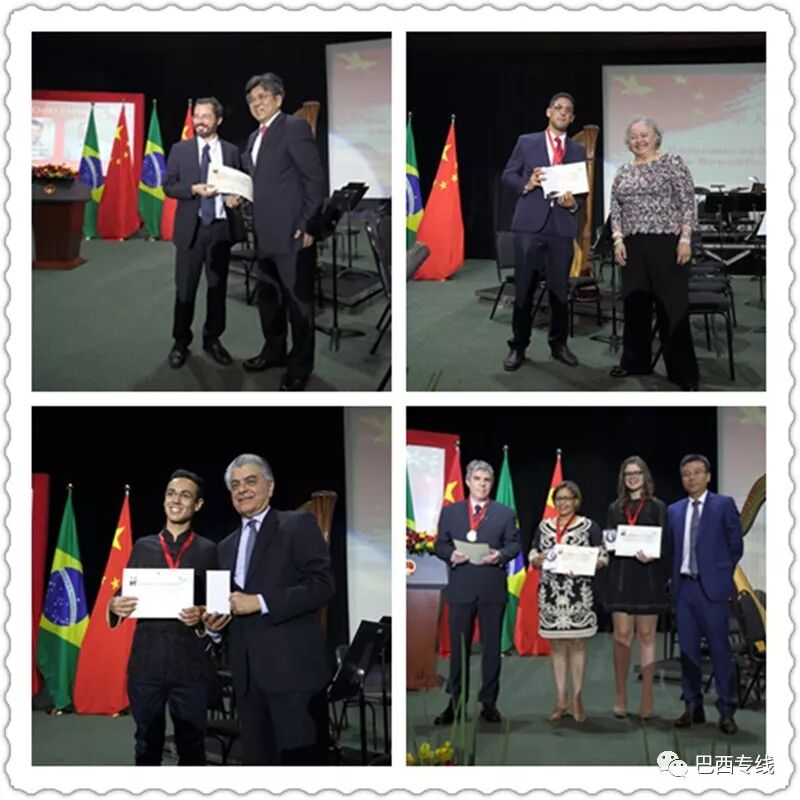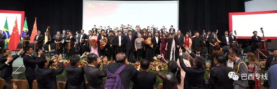 此后,中国浙江交响乐团、巴西克劳迪奥·桑托罗国家剧院交响乐团以及中巴歌唱家联袂上演了“西洋与民族乐器共振、桑巴舞曲与交响乐交辉”的音乐盛宴。在著名指挥家简柏坚“为我一挥手、如听万壑松”的高超指挥下,一段段或高昂或悠扬的乐曲在礼堂回响:笛子演奏家汪悦洲的《水乡船歌》空灵细腻,把观众们带到了南国水乡;小提琴演奏家何凡独奏的中国名曲《浪漫曲三首》缠绵悱恻、优美动听;巴西名曲《感伤的旋律》和《伦巴达》一个婉转低回,一个热情如火,体现了巴西人民丰富的情感世界;著名歌唱家丁毅演唱的中国名曲《那就是我》、女高音歌唱家王莹声情并茂的《月亮颂》、中巴艺术家饱含深情的《我爱你中国》更是“此夜曲中闻折柳,何人不起故园情”,勾起了在巴华侨华人的“游子心、赤子情”,也让巴西观众心潮澎湃,如痴如醉,现场掌声不断,气氛热烈。演出结束后,李大使夫妇与巴方来宾代表一同上台与演员合影留念,祝贺音乐会取得圆满成功。