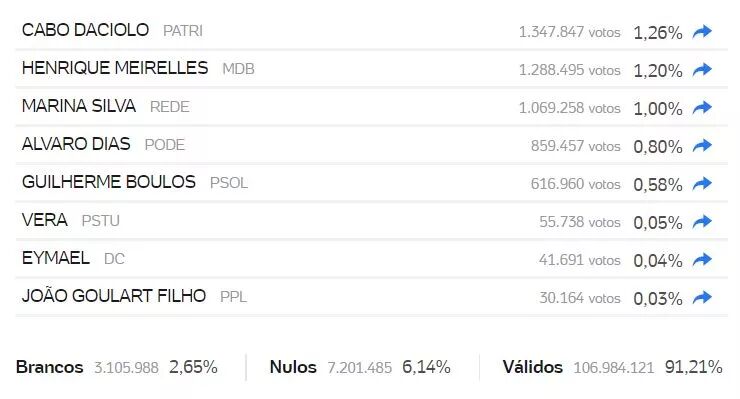 以下是来自最高选举法院(TSE)的官方统计结果(截至发稿时间,统计率99.94%):