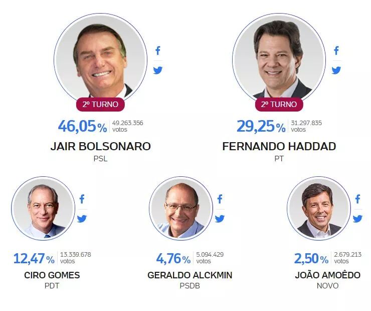 10月7日,巴西总统大选第一轮投票结果公布,社会自由党候选人贾尔·博索纳洛(Jair Bolsonaro)和共党候选人费尔南多·哈达德(Fernando Haddad)成功晋级第二轮,巴西下一届总统将在他们两人之中决出。