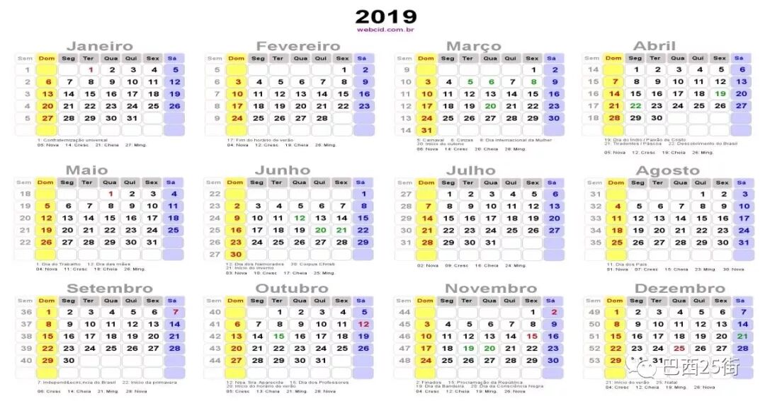 此外,2019年5月1日的劳动节和12月25日的圣诞节都在周三,1月1日的元旦是周二,4月19日的基督受难日是周五,6月20日的圣体节是周四,11月15日的共和国成立日是周五。在这些日子里,巴西的劳动者们可以放假并充分享受假期。