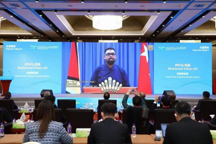 圭亚那共和国总统伊尔凡.阿里阁下,全国人大环境与资源保护委员会委员王秀峰,国际可再生能源署总干事弗朗西斯科.拉卡拉梅,联合国环境规划署驻华代表涂瑞和,生态环境部法规与标准司司长别涛,生态环境部对外合作与交流中心主任张玉军,埃及、蒙古国、巴基斯坦、刚果(金)民主共和国、乌拉圭等20多个国家的驻华使节出席论坛开幕式。