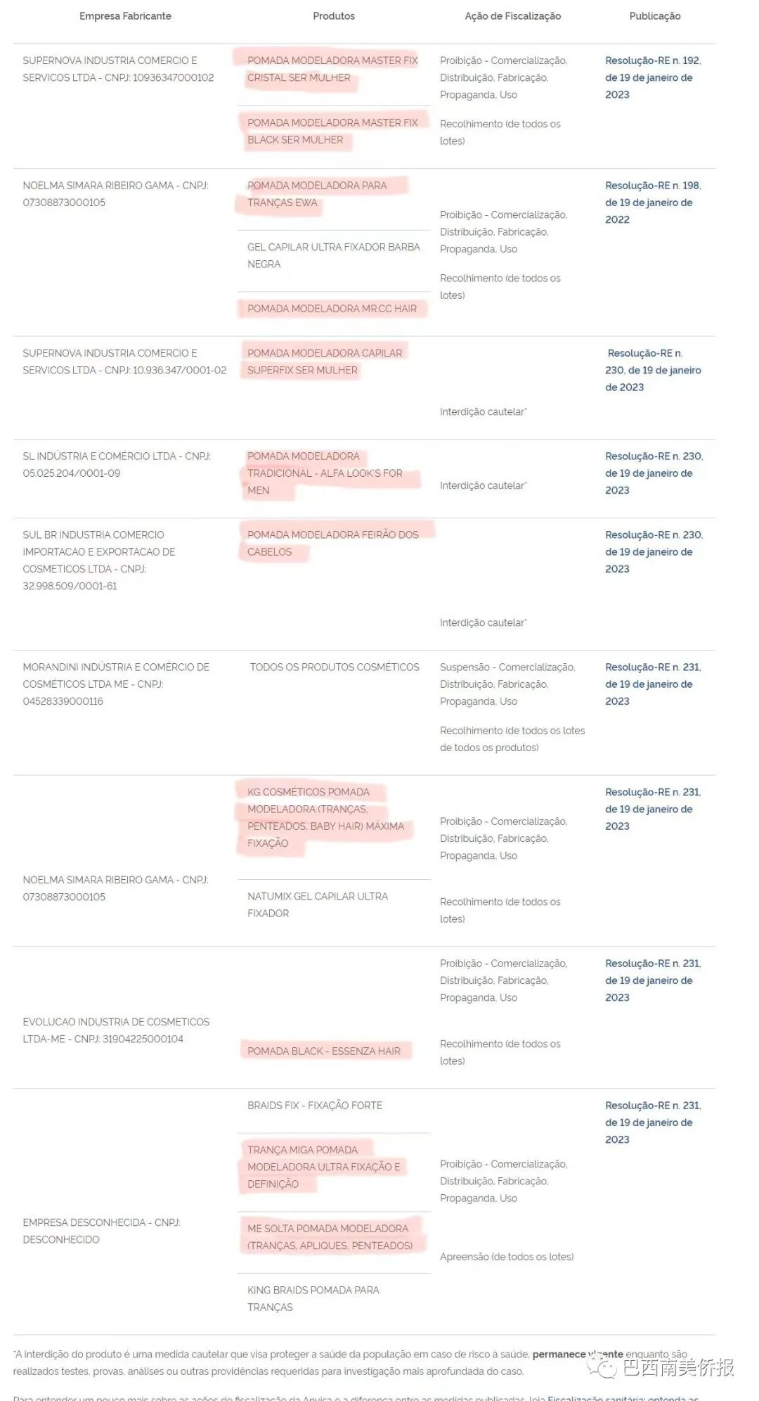 巴西国家通讯社1月29日报道,Anvisa表示,这些定型发膏是Anvisa和当地卫生监督机构的调查对象,因为接到了顾客使用后出现严重不良反应的报告。