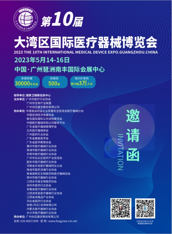 2023年5月14-16日由中国医疗器行业协会指导,广州市医疗行业协会和广州创迈展览策划有限司联合主办的第10届大湾区国际医疗器械博览会,在广州琶洲南丰国际会展中心开幕!