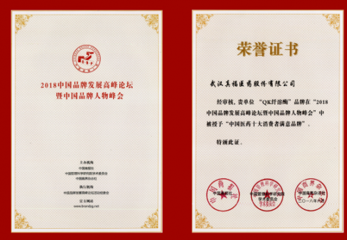 经审核,贵单位 “QK纤溶酶”品牌在“2018 中国品牌发展高峰论坛暨中国品牌人物峰会”中被授予“中国医药十大消费者满意品牌”。