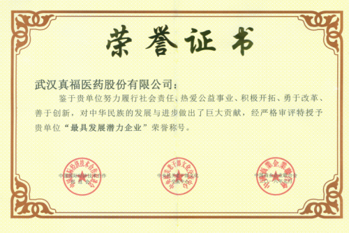 鉴于贵单位努力履行社会责任、热爱公益事业、积极开辟、勇于改革、善于创新,对中华民族的发展与进步作出了巨大贡献,经严格审评特授予贵单位“最具发展潜力企业”荣誉称号。