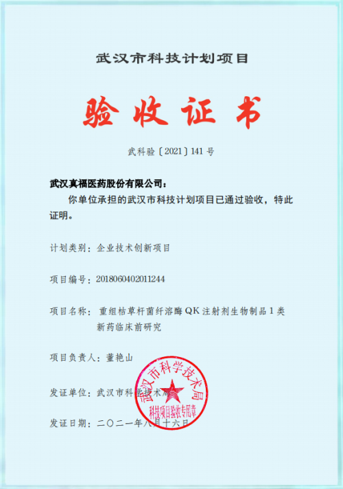项目名称:重组枯草杆菌纤溶酶QK注射剂生物制品1类