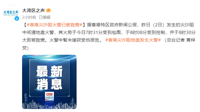 据香港特区政府新闻公报,昨日(3月2日)发生的尖沙咀中间道地盘火警,其火势于今日7时31分受到包围,于8时08分受到控制,并于8时30分大致被救熄。火警中暂未接获受伤报告。