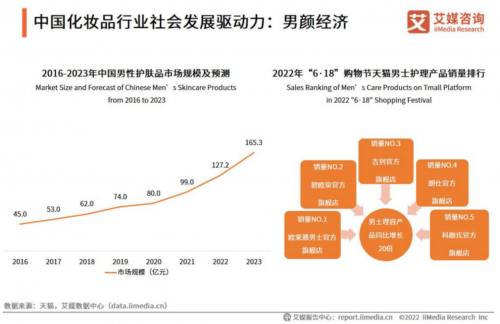 数据显示,2021年中国男性护肤品市场规模为99亿元,同比增长23.8%,预计2023年将突破165.3亿元。很显然,“男颜经济”正逐步成为行业发展新的驱动力。