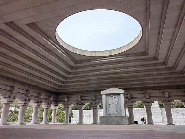 站在大院广场上,西侧的“闻天”大鼓有响彻九州大地之势,东侧的“龙魂”大钟高3.8米,重约12吨,庄重凝练,博大精深;广场北端的祭祀大殿是由36根石柱合围而成的方形空间,中央是黄帝的巨型石刻浮雕像,屋顶有直径14米的圆形天光。大殿整体呈“天圆地方”之感,也寓意黄帝之功绩与天地同在,与日月同辉。