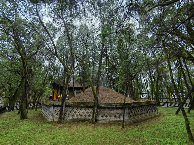 黄帝陵。新华社记者孙正好摄祭亭中央立“黄帝陵”碑,由郭沫若所书,亭后方是黄帝陵寝。陵高3.6米,周长48米,是青砖拱卫呈环丘状的土冢。陵冢之上,长着数棵参天巨柏;陵冢正前方立一石碑,上书“桥山龙驭”四字。