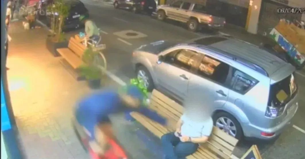 一段由监控摄像头拍摄的视频显示了一个骑着自行车的男孩侵入人行道并抢走了坐在长椅上的店主的手机的瞬间。