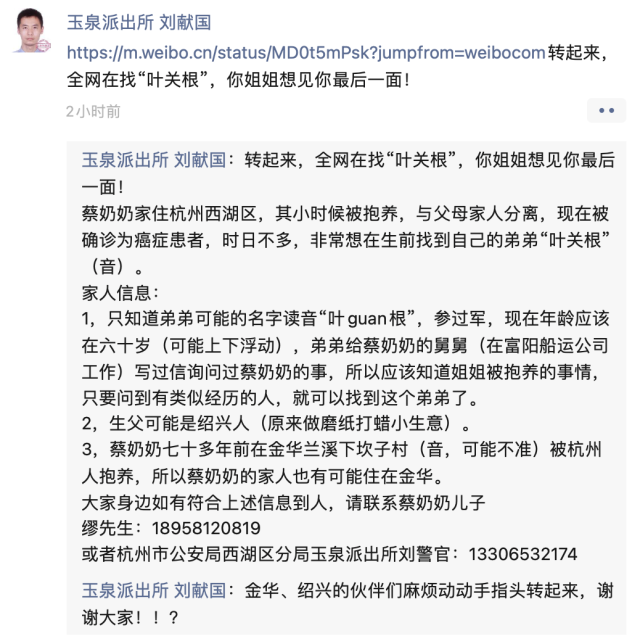 今天,记者在朋友圈里刷到了一条特别的“寻人启事”。发布人是西湖公安分局玉泉派出所的“反诈大使”刘献国。和以往使出“十八般武艺”在朋友圈进行反诈宣传不同,今天,热心的刘警官是要帮辖区一位79岁的奶奶寻找自己的亲人。