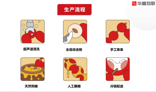 华喜物联糖葫芦售货机售卖的糖葫芦,与街边家庭式生产的糖葫芦不同,拥有标准化的生产流程:超声波清洗、全自动去核、手工串串、天然熬糖、人工蘸糖、冷链配送,让每一串糖葫芦都经得起卫生检验。