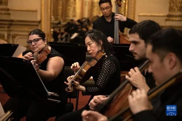 4月25日,在阿根廷布宜诺斯艾利斯的科隆剧院金色大厅,阿根廷科隆剧院高等艺术学院与中国国家大剧院管弦乐团举办联合音乐会。新华社发(马丁·萨巴拉 摄)