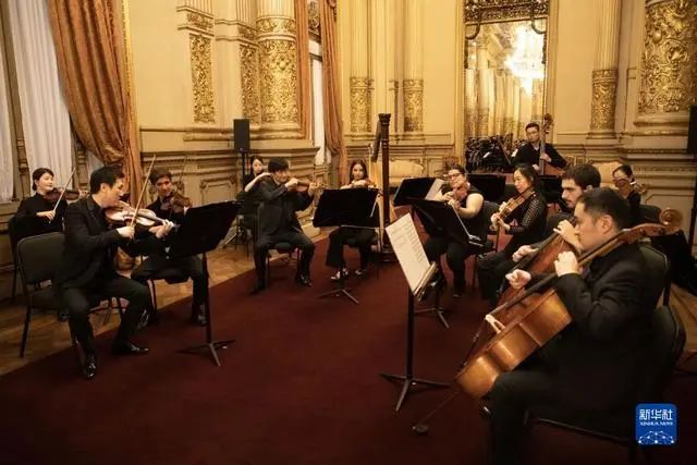 阿根廷科隆剧院高等艺术学院与中国国家大剧院管弦乐团联合音乐会25日下午在科隆剧院金色大厅上演,演奏家们演奏了门德尔松《E小调第四号弦乐四重奏》和《紫竹调》等8首中西管弦乐曲。