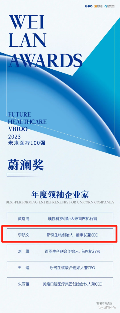 值得一提的是,斯微生物创始人、董事长兼CEO李航文博士也凭借多年在RNA及癌症免疫治疗领域的经验,荣获“未来医疗100强·蔚澜奖”年度领袖企业家奖项。作为一位拥有创业者的无畏与企业家的眼光和魄力的领导者,李航文博士在mRNA行业开拓创新的精神令人敬佩。