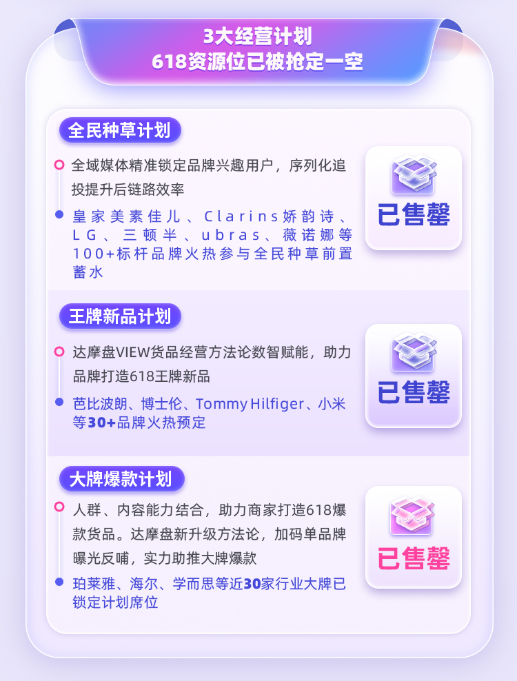 阿里妈妈618期间重磅推出「全民种草计划」、「王牌新品计划」、「大牌爆款计划」,依托达摩盘数智经营工具、应用DPLK人群方法论、 VIEW货品方法论、Uni-START内容方法论、及序列化能力助力商家种草-拉新-打爆全链路经营提效,目前160席限量名额已全部售罄。