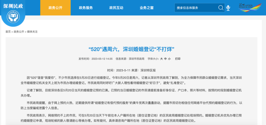5月12日,据广东省深圳市民政局宣布“‘520’遇周六,深圳婚姻登记‘不打烊’”。公告称,为全力保障市民群众婚姻登记需求,当天深圳全市婚姻登记机关全天上班为市民办理结婚登记。目前深圳各区5月20日当天的婚姻登记预约已满。已预约当日婚姻登记的市民请提前准备好身份证、户口本、照片等材料,按预约时段到婚姻登记机关办理。