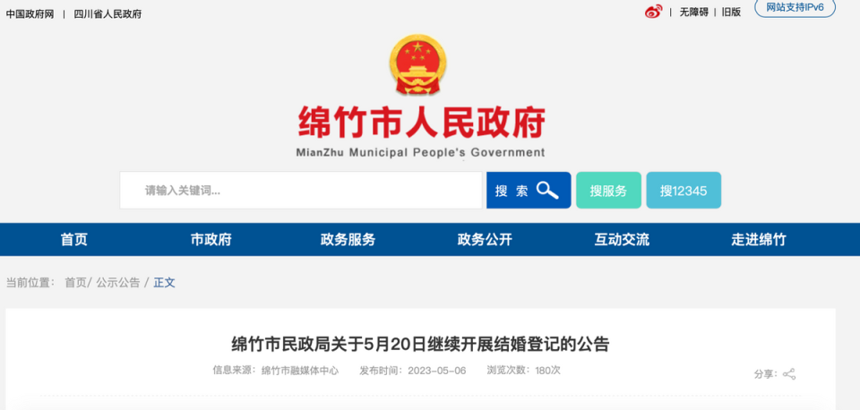 5月6日,四川省绵竹市民政局也发布了5月20日继续开展结婚登记的公告。公告称,今年5月20日正值周六休假,为满足新人们在“5·20”当天登记结婚的美好愿望,绵竹市民政局婚姻登记处将于5月20日为爱加班,正常办理结婚登记业务。