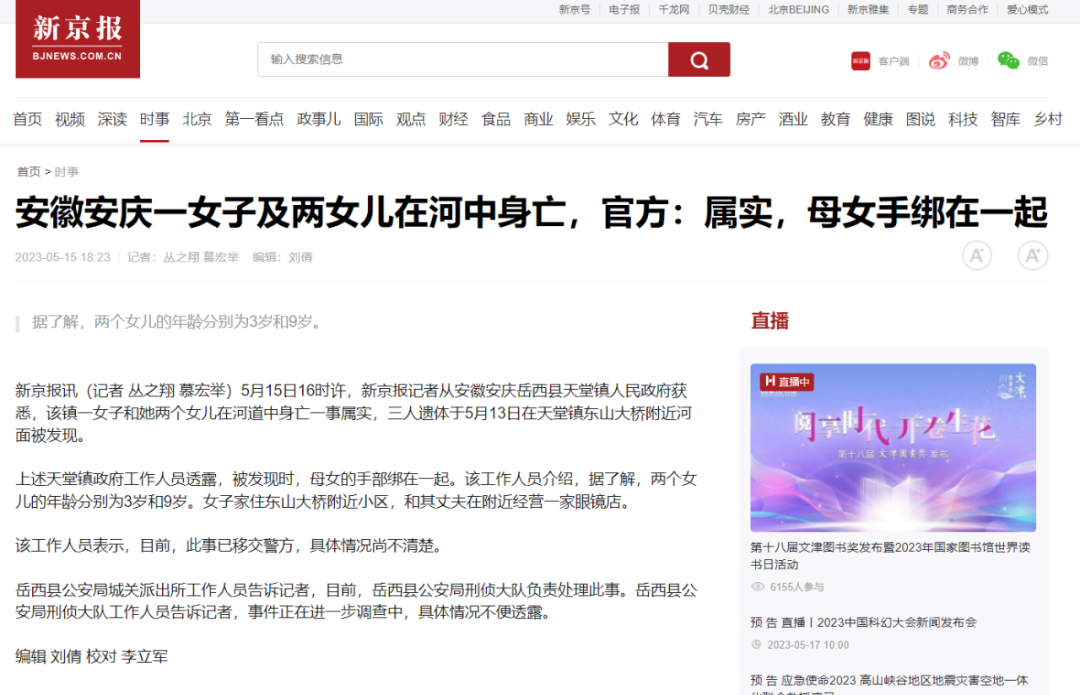 5月15日16时许,记者从安徽安庆岳西县天堂镇人民政府获悉,该镇一女子和她两个女儿在河道中身亡一事属实,三人遗体于5月13日在天堂镇东山大桥附近河面被发现。