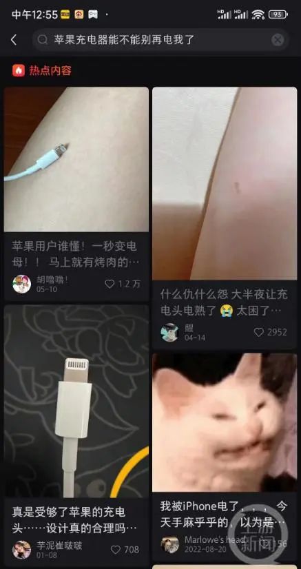 记者搜索各大社交媒体平台发现多条苹果充电线漏电的帖子,热门帖子的相关评论已达数千条,大都分享了自己被电的经历。