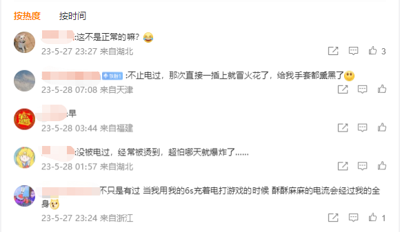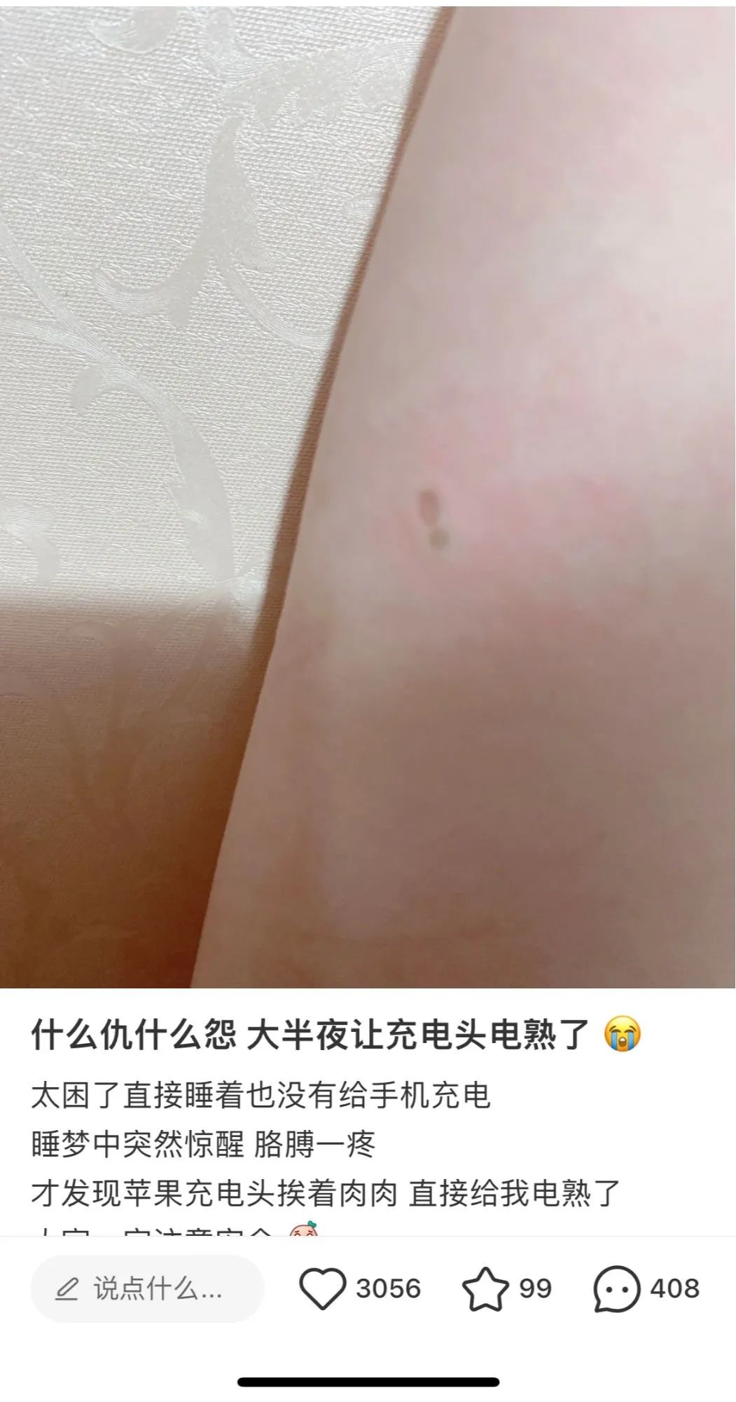 就博主“醒”睡觉被充电插头电伤的情况,技术代表建议:“为了避免这种情况发生,建议睡觉时充电线远离床铺,或者不充电时把充电器拔掉。”