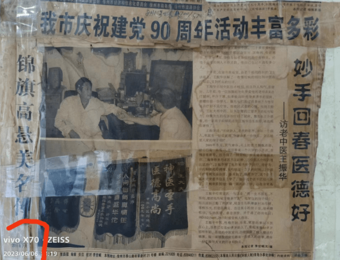 在2011年7月徐州人民日报《环球人物》刊登这样一则新闻“锦旗高悬美名传,妙手回春医德好--访老中医王振华”