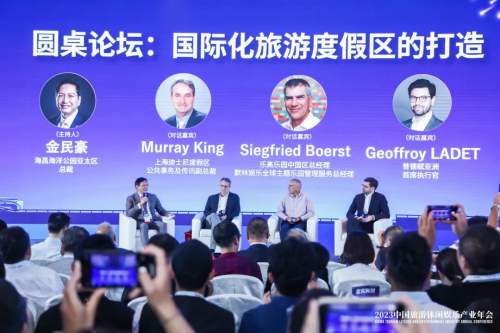 海昌海洋公园亚太区总裁金民豪、上海迪士尼度假区公共事务及传讯副总裁Murray King(王凯)、乐高乐园中国区总经理&默林娱乐全球主题乐园管理服务总经理Siegfried Boerst、普德赋亚洲首席执行官Geoffroy LADET以“国际化旅游度假区的打造”为主题进行了圆桌讨论。