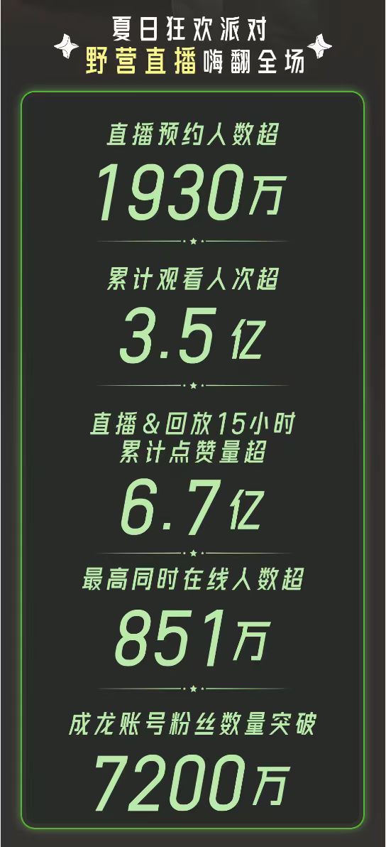 据战报显示,成龙夏日狂欢派对直播间累计观看人次超3.5亿,最高同时在线在观看人数超851万,有超过1930万快手用户成功预约此次的「野营谈唱会」。而在直播期间,成龙的快手账号粉丝数飙升,新增1000多万粉丝。截至目前,成龙的快手账号粉丝量已突破7200万,成为当前快手站内粉丝量最多的明星账号。不管是大家心目中当之无愧的“大哥”,还是快手老铁更喜欢称呼的“龙叔”,成龙在快手用真心广结天下老铁。